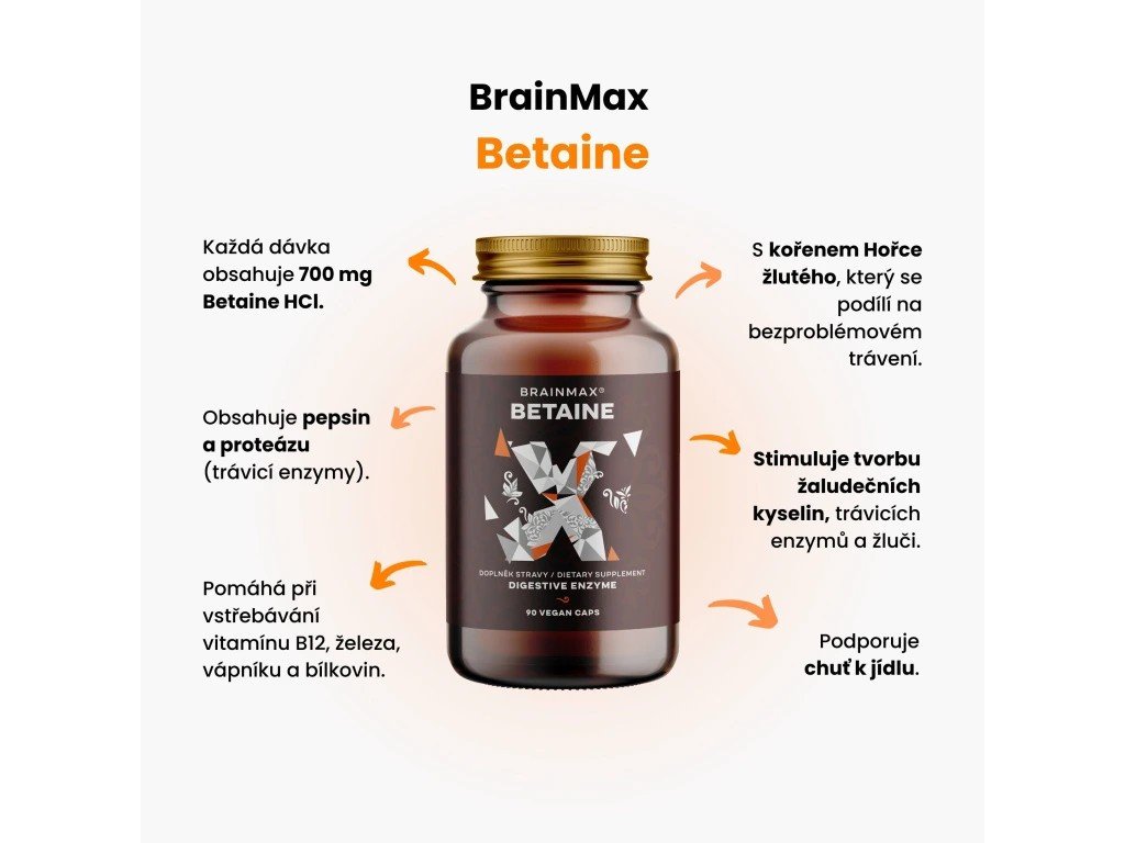 Betaine HCl je sloučenina, která pomáhá udržovat zdravou hladinu pH v žaludku a tenkém střevě. Příznivě působí na trávení, žaludek a stimuluje tvorbu kyseliny chlorovodíkové v žaludku. Betain je zde zkombinován spolu s hořcem žlutým. Ten podporuje normální produkci žaludečních kyselin, trávicích enzymů a žluči. Zkrátka všeho, co se podílí na správném trávení. BrainMax Betaine HCl obsahuje také pepsin, který je důležitý pro správné trávení bílkovin. Jakmile se tyto vazby naruší, uvolní se jednotlivé aminokyseliny, které se poté využijí pro stavbu tělesných bílkovin.