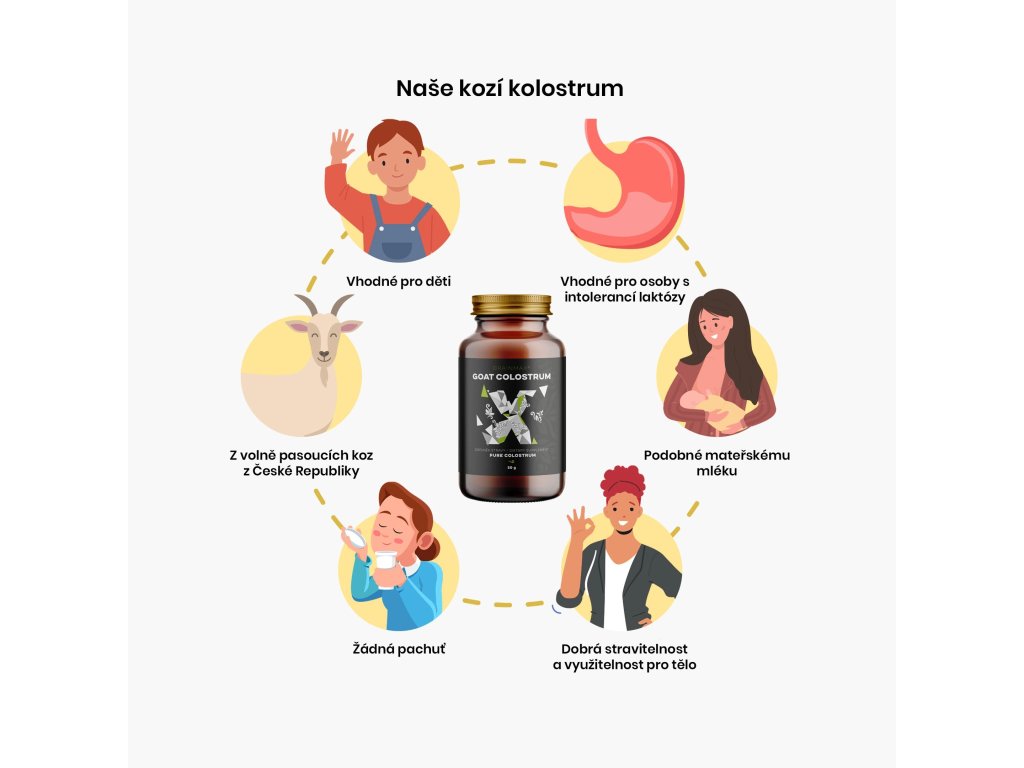 Kozí kolostrum v rostlinných kapslích je unikátní širokou škálou bioaktivních sloučenin jako jsou imunoglobuliny a laktoferiny, které posilují obranyschopnost organismu. Kolostrum je šetrně získáváno z volně pasoucích koz na české farmě. Poté je kolostrum sušeno mrazem (lyofilizace) tak, aby se dalším zpracováním nezničila biologická hodnota kolostra. To vše s maximálním důrazem na čistotou. Kolostrum je uloženo v rostlinných kapslích a dobře jej snáší i lidé s intolerancí laktózy. V produkci je dodržený etický postup, který zaručuje, že první dávku kolostra dostávají kůzlata a poté je šetrně odebráno pro vlastní spotřebu.
