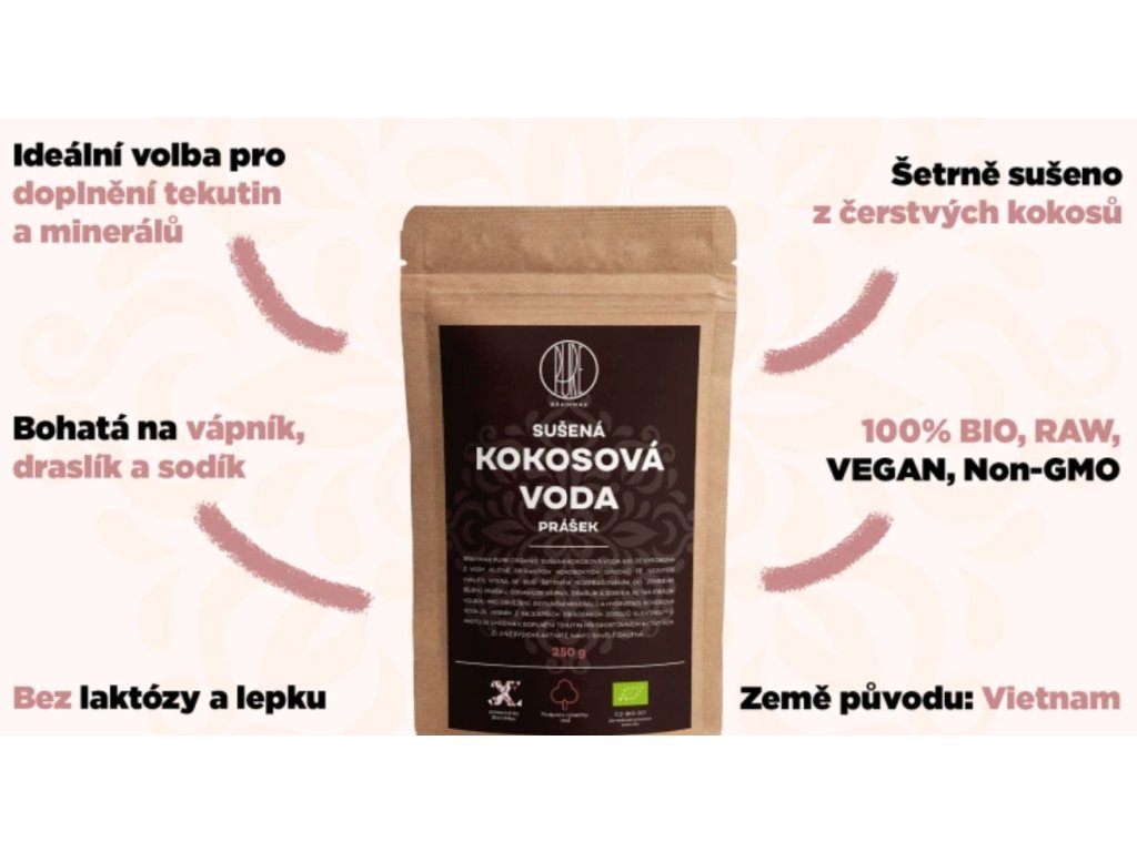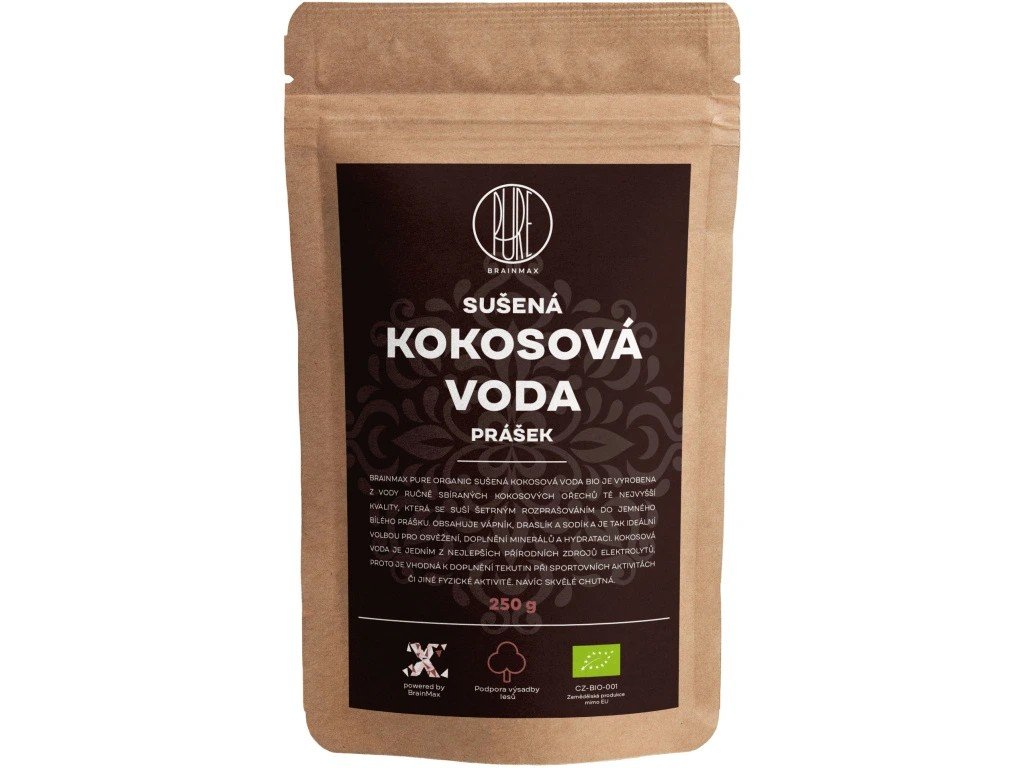 BrainMax Pure Kokosová voda bio prášek, 250 g je snadno použitelný lahodný prášek, který je extrahována z čerstvých BIO kokosů pěstovaných ve Vietnamu. Voda z mladých kokosů je pomalu odpařována a sušena do prášku bez přidaného cukru, aroma a barviv. Po rozmíchání ve vodě má svěží, lehce nasládlou chuť. Je vhodný pro rychlé doplnění tekutin, pro každodenní osvěžení v horkých letních dnech a zejména pro sportovce. Kokosová voda obsahuje důležité elektrolyty, především draslík, které ovlivňují hydrataci a pH těla. Je bez tuků a obsahuje jen malé množství cukrů, navíc je zásaditá.