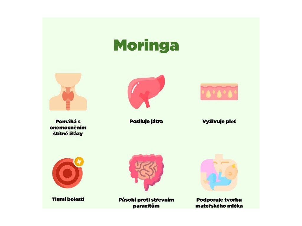 Listy Moringy pocházejí ze stromu Moringa oleifera pocházejícího z Indie. Moringa patří mezi významné superpotraviny, protože obsahují komplex živin jako jsou vitamíny, minerály a esenciální aminokyseliny. Moringa patří mezi jedny z nejlepších přírodních zdrojů antioxidantů a bioaktivních rostlinných sloučenin. Listy jsou bohaté na mnoho důležitých živin včetně bílkovin, vitamínu B6, vitamínu C, riboflavinu a železa. Kromě toho obsahuje také chlorofyl a je tak právem považována za elixír života.