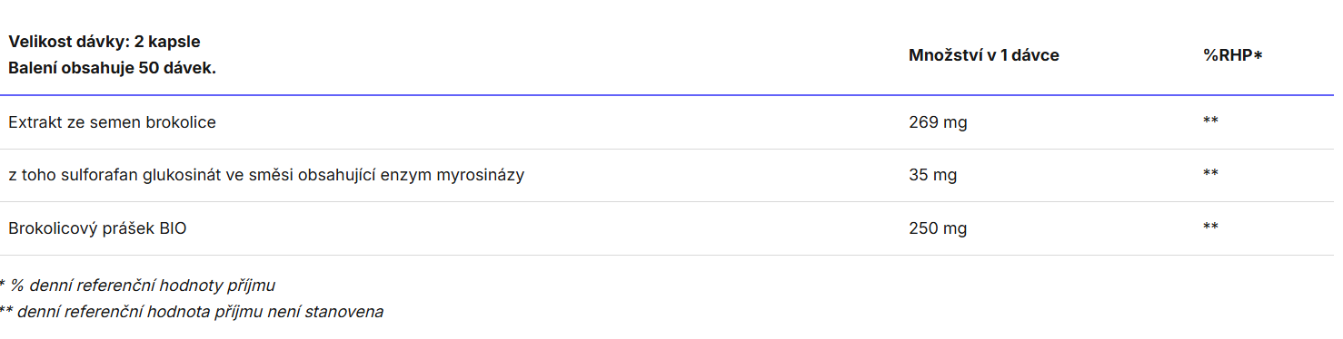 Složení: Extrakt ze semen brokolice (Brassica oleracea) obsahující sulforafan glukosinát ve vlastní směsi obsahující enzym myrosinázy, brokolicový prášek BIO. Rostlinná kapsle na bázi HPMC.