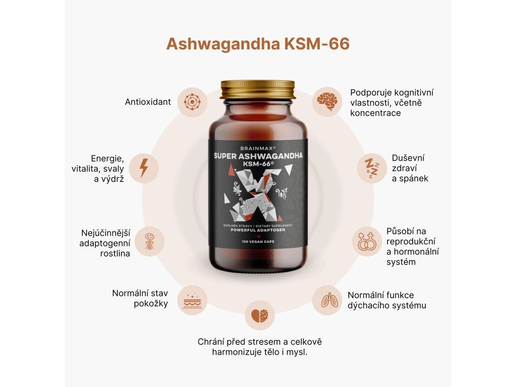Ashwagandha, neboli vitánie snodárná, je známá svou schopností zmírnit stres, fyzické i duševní napětí a podpořit životní vitalitu. Pomáhá optimalizovat hormonální systém, který může být stresem narušen. Extrakt z Ashwagandhy je standardizovaný na 5 % witanolidů. Bioaktivních látek, které jsou u Ashwagandhy klíčovým ukazatelem její kvality a síly. KSM-66® je patentovaný extrakt z BIO ashwagandhy, vyrobený pomocí patentovaného postupu s použitím pouze kořenů, ke kterým se vážou i klinické studie.