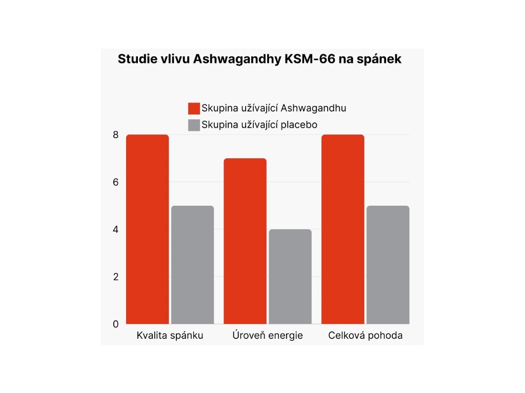 Ve dvojitě zaslepené, randomizované studii z roku 2020, kontrolující placebem, která využívala KSM-66® Ashwagandhu, ukázali účastníci ve věku 65 až 80 let, kteří užívali 600 mg ashwagandhy denně po dobu 12 týdnů, významné zlepšení v kvalitě spánku.6