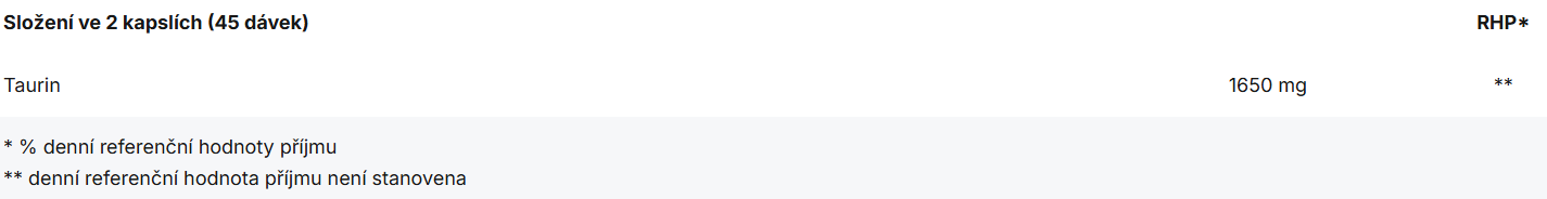 Složení: Taurin, rostlinná kapsle na bázi HPMC. Neobsahuje žádné balastní látky. Vhodné pro vegany.