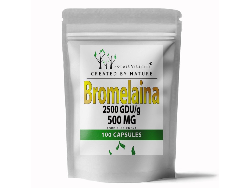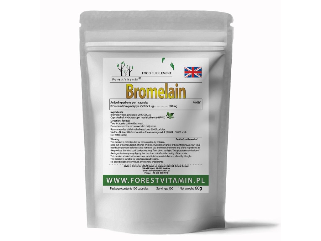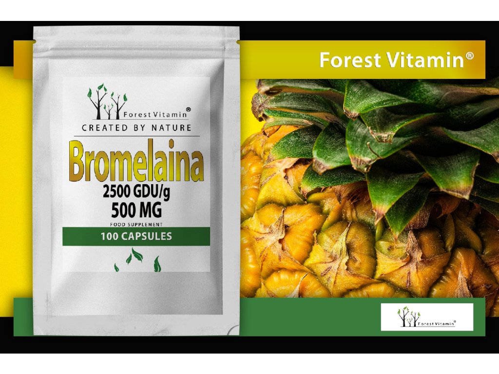 Forest Vitamin® Bromelain 500 mg – 100 HPMC kapslí přírodní proteolytický enzym extrahovaný z rostliny ananasu (Ananas comosus), který je již mnoho let oblíbený mezi lidmi, kteří hledají podporu pro správné trávicí procesy a celkovou tělesnou kondici. Tato látka se nachází v různých částech ananasu - jak v ovoci, tak ve stonku. Doplňky stravy nejčastěji používají bromelain získaný ze stonku, protože obsahuje vyšší koncentraci aktivních enzymů.