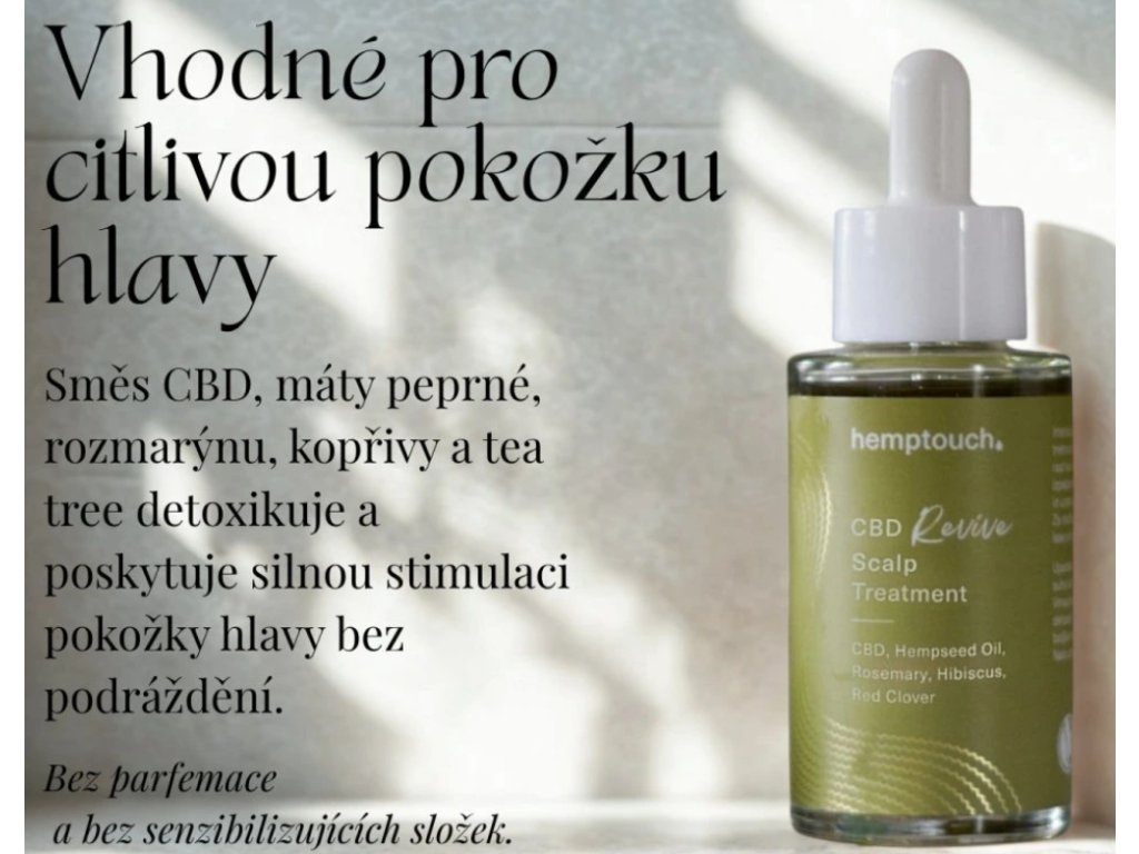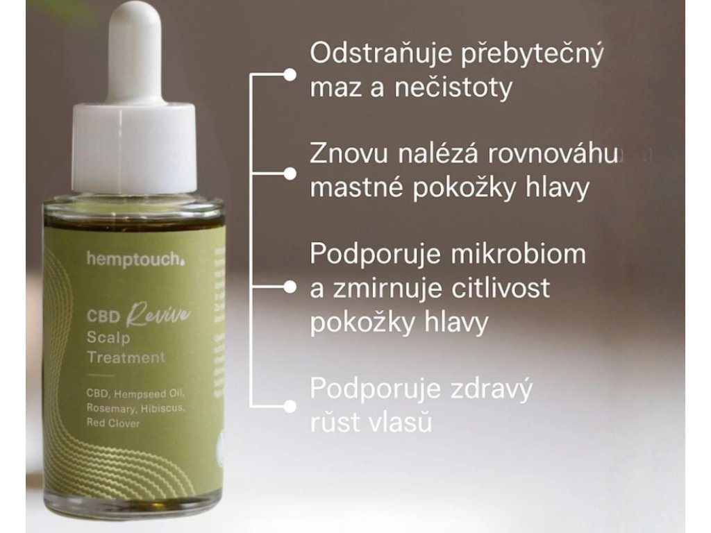 Hemptouch CBD Revive, intenzivní kúra pro pokožku hlavy 50 ml s klinicky ověřenými aktivními látkami pro stimulaci růst vlasů, ochranu před vypadáváním a obnovu rovnováhy vlasové pokožky. Lehce vstřebatelná olejová textura bez mastného filmu. Vhodné pro všechny typy vlasové pokožky, včetně citlivé. Dermatologicky testováno, bezpečné i v těhotenství a při kojení.
