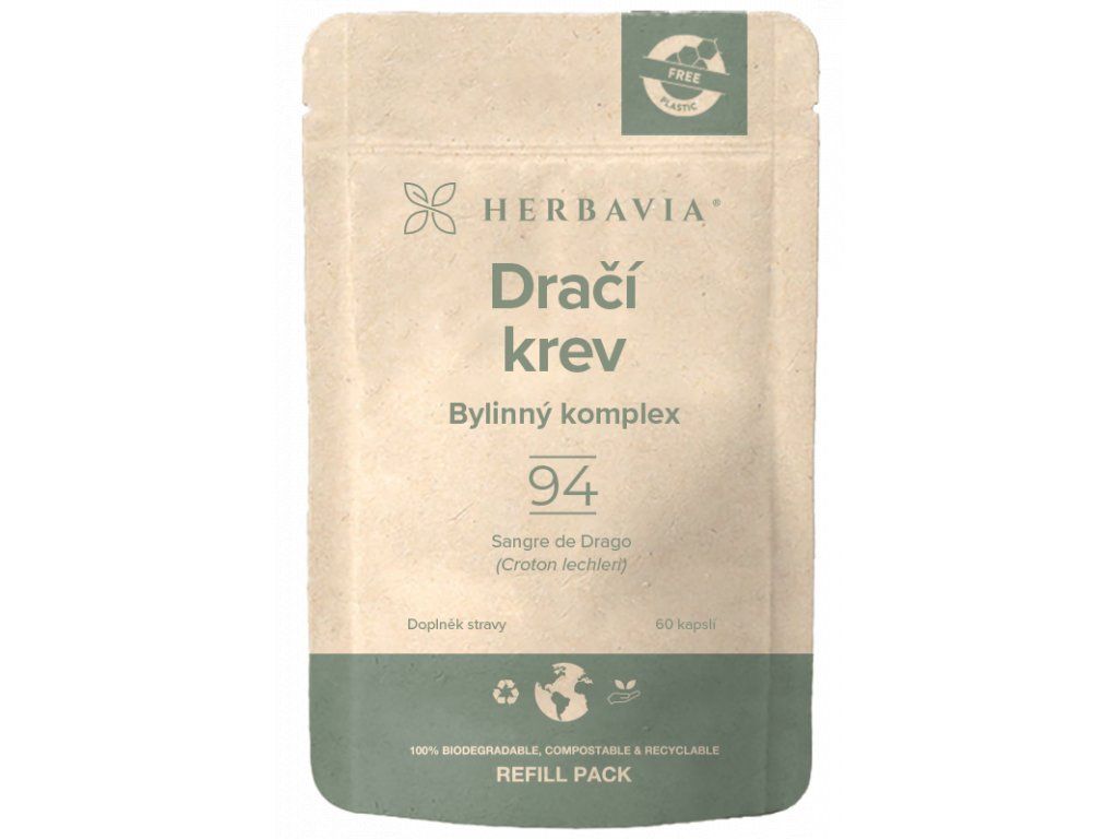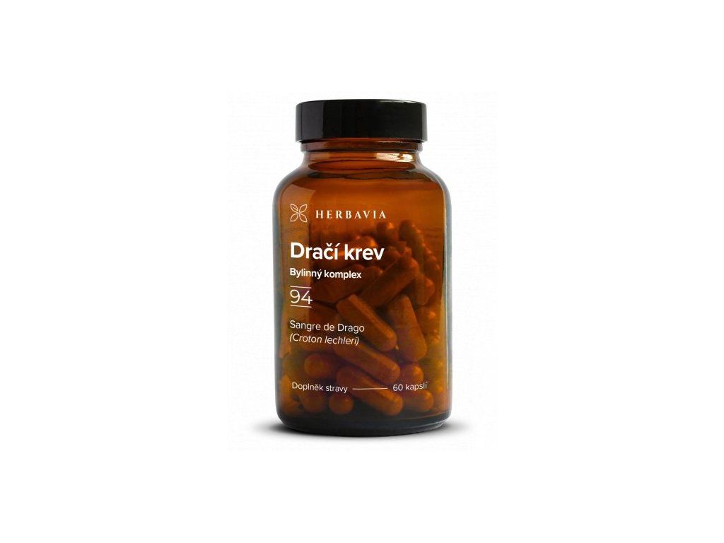 Herbavia Dračí krev, Bylinný komplex, 60 kapslí je 100% čistý, netoxický extrakt z pryskyřice stromu Croton lechleri Muell, Arg., peruánskými indiány nazývanou Sangre de Drago - Dračí krev. Kapsle jsou 100% vegan.