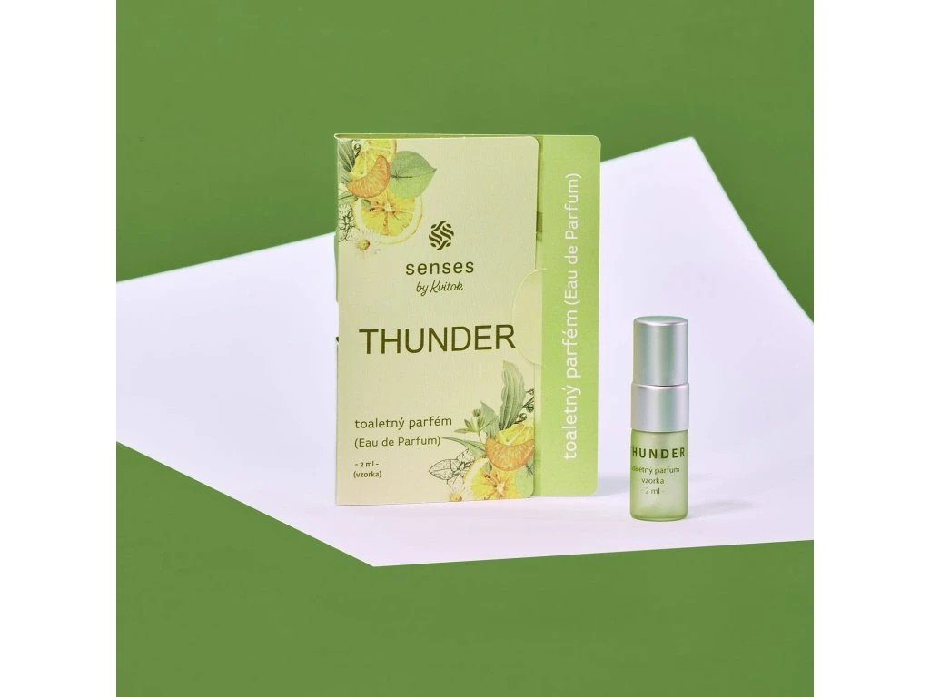 Kvitok Senses - Thunder (Edp) komponuje vrchní tóny máty s nádechem citrusů, které lehce přechází do pikantní kombinace hořkého pomeranče a černého pepře, aby se v závěru rozvinul dřevitý základ ze santalového dřeva a pačuli.