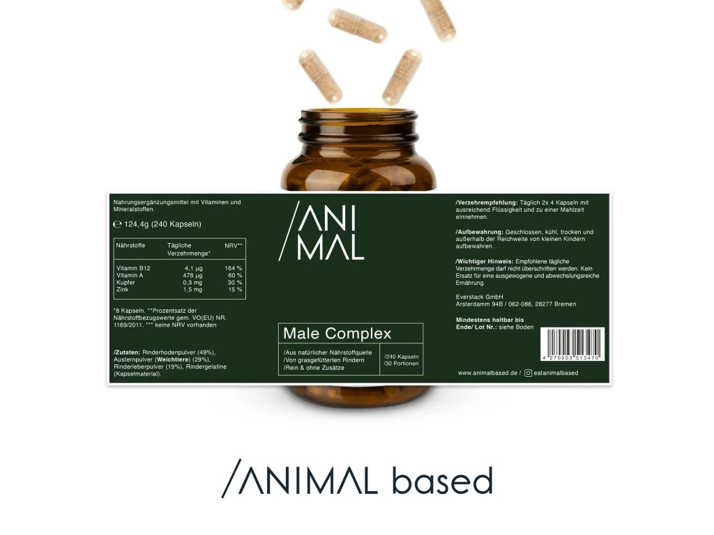 ANIMAL Male Complex je unikátní doplněk stravy pro muže, který kombinuje hovězí varlata, játra a ústřice z grass-fed chovu. Tento silný „nose-to-tail“ komplex přirozeně doplňuje klíčové živiny jako zinek, vitamín B12 a měď, které podporují testosteron, energii a imunitu.