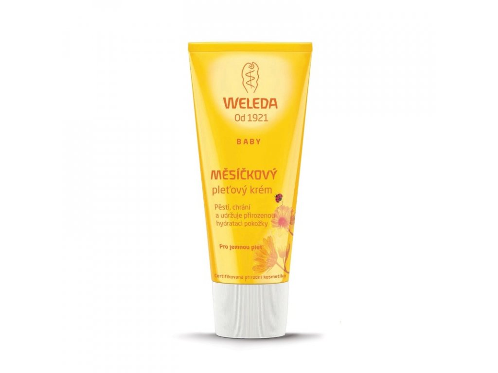 Weleda Měsíčkový pleťový krém chrání a pěstí citlivou pokožku obličeje kojenců i dětí. Mandlový olej udržuje pokožku vláčnou, včelí vosk a tuk z ovčí vlny ji chrání před vysušením a zajišťují její přirozenou hydrataci. Výtažek z měsíčku lékařského v BIO kvalitě má hojivé a zklidňující účinky.