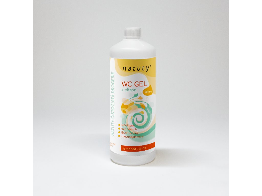 Natuty WC gel s vůní citronu 850ml je 100% přírodní účinný prostředek k čištění toalety pod i nad vodní hladinou. Jeho složení je bez kompromisů! Zcela rozložitelný, silný a účinný WC gel zbaví toaletu všech nečistot. Odstraní vodní kámen a zanechá ji zářivě čistou a voňavou.