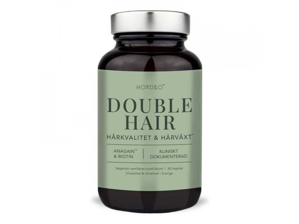 Nordbo Double Hair je velmi precizně zacílený doplněk stravy kombinují patentovaný extrakt AnaGainTM z BIO hrachových klíčků s vysokou dávkou biotinu. Vlastnosti těchto dvou složek jsou synergní a souvisejí se stimulací vlasových folikul, redukcí ztráty vlasů a jejich kondicí. AnaGainTM je speciální extrakt z hrachový klíčků, které jsou bohaté na složky aktivující buňky ve vlasových folikulech. Obnovují v nich mikrocirkulaci živin. Vlastnosti biotinu souvisejí s produkcí keratinu, který zvyšuje kvalitu vlasů. AnaGainTM byl testován v klinické studii s jedinci trpícími středně závažným vypadáváním. Po dvou měsících se snížila ztráta vlasů o 37 % a došlo k viditelnému zpevnění vlasových vláken.