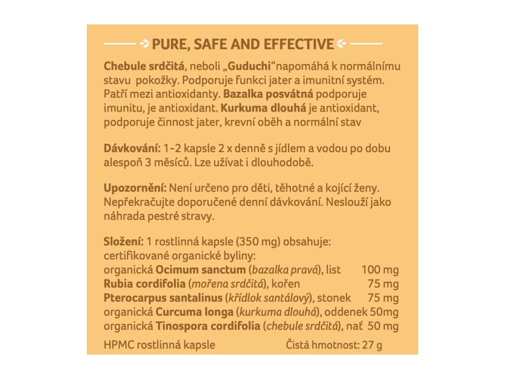 Složení: Bazalka posvátná (Ocimum sanctum), Křídlok santilový (Pterocarpus santalinus), Mořena srdčitá (Rubia cordifolia), Kurkuma dlouhá (Curcuma longa), Chebule srdčitá (Tinospora cordifolia)