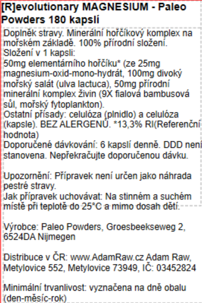 Paleo Powders [R]evolutionary MAGNESIUM 180 kapslí přijetím dvou různých přírodních forem hořčíku s komplementární rychlostí vstřebávání a přidáním fascinující směsi živin, tak elegantní a komplexní, kterou může poskytnout pouze příroda, vznikl silný doplněk hořčíku. Je vhodný pro každého, kdo hledá vyšší terapeutickou dávku, stejně jako pro ty, kteří chtějí doplnit svou denní výživu jen o ten malý, ale důmyslný kousek navíc..