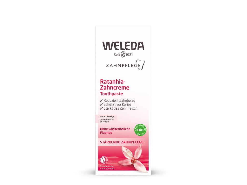 Weleda Ratanhová zubní pasta je svěží Ratanhová zubní pasta čistí chrup jemně a důkladně. Svěží chuť jí dodávají éterické oleje z máty peprné a máty kadeřavé. Výtažek z kořene jihoamerické ratanhy (Krameria triandra) má stahující účinky, předchází krvácení z dásní. Jemné čisticí účinky dodává zubní pastě plavená křída a přirozeně posiluje dásně.