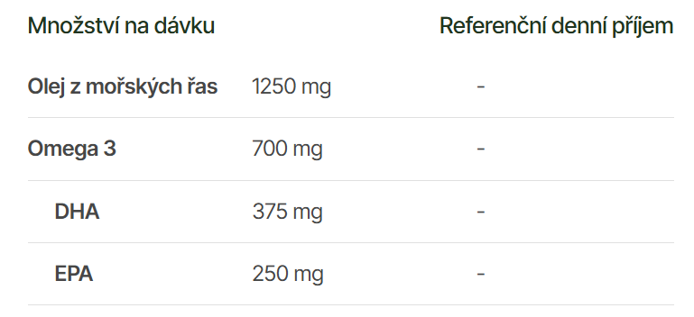 - skvělý poměr EPA a DHA I 700 mg omega 3 - 375 mg DHA I 250 mg EPA