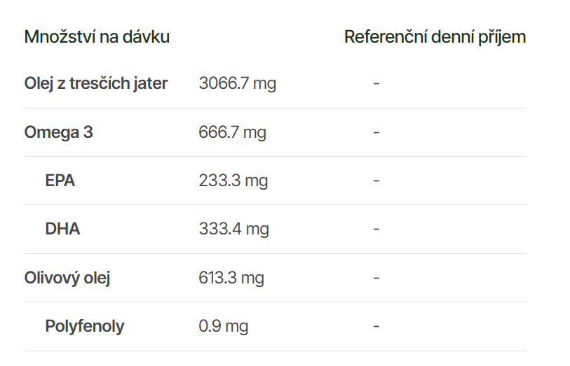 Prémiový olej z tresčích jater lovených udržitelným způsobem se nachází ve formě triglyceridů, která je pro lidský organismus přirozená a zajišťuje vysokou biodostupnost. Bio éterický olej z citronu a krvavého pomeranče zlepšuje výslednou chuť doplňku.