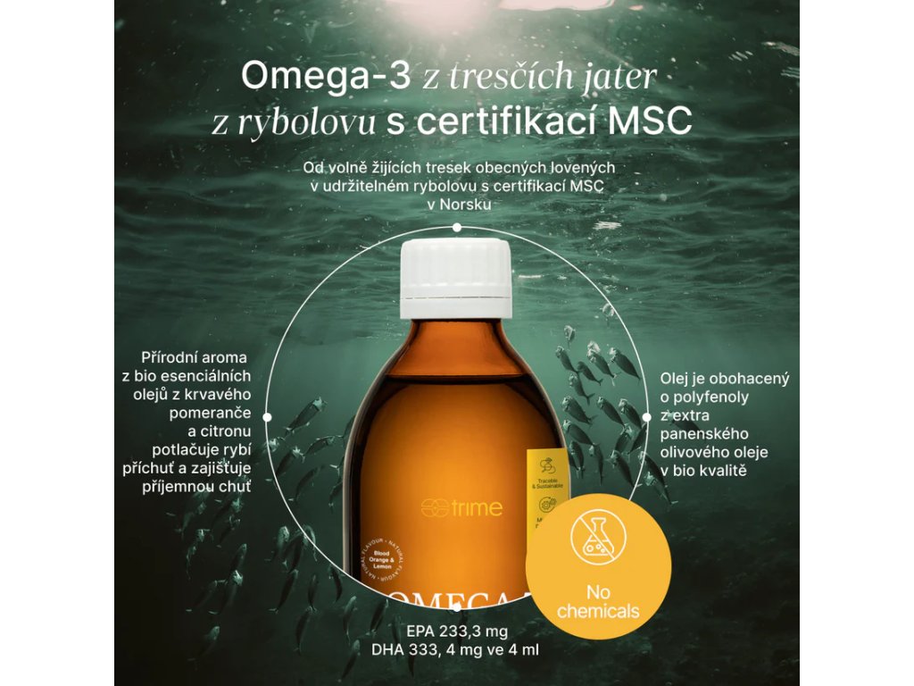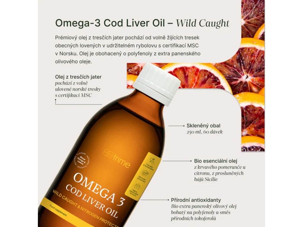 Trime Omega-3 Cod Liver Oil 250 ml je prémiový olej ve skle, pochází z tresčích jater volně žijících tresek obecných lovených v udržitelném rybolovu v Norsku. Olej je obohacený o polyfenoly z extra panenského olivového oleje. Přírodní aroma z bio esenciálních olejů z krvavého pomeranče a citronu potlačuje rybí příchuť a zajišťuje příjemnou chuť.