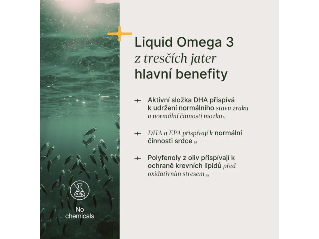 Prémiový olej z tresčích jater lovených udržitelným způsobem se nachází ve formě triglyceridů, která je pro lidský organismus přirozená a zajišťuje vysokou biodostupnost. Bio éterický olej z citronu a krvavého pomeranče zlepšuje výslednou chuť doplňku.
