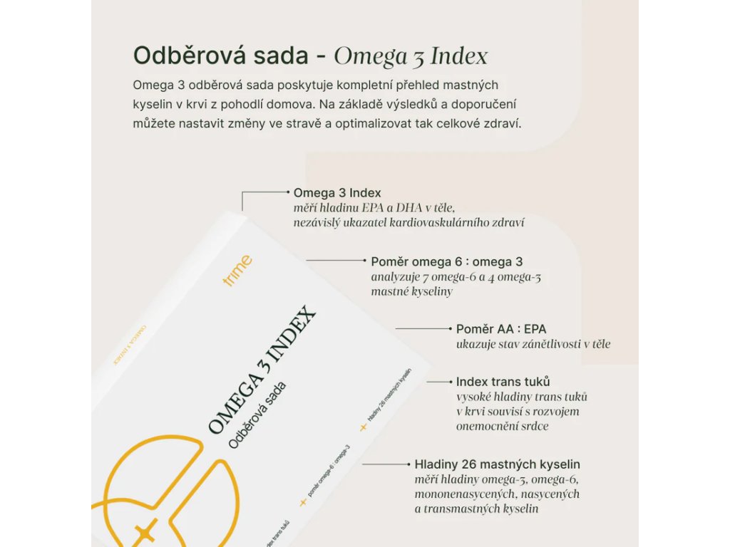 Omega 3 Index měří obsah dvou hlavních omega-3 mastných kyselin (EPA a DHA) v membránách červených krvinek. Vyšší podíl EPA a DHA v membránách (ideálně v rozmezí 8 - 12%) odpovídá vyváženému příjmu omega-3 a omega-6 mastných kyselin a je ukazatelem lepšího zdraví kardiovaskulárního systému, očí, mozku a kloubů.